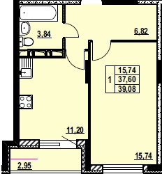 ОДНОКОМНАТНАЯ №1139.08 м2 Однокомнатная №11свободнаОбщая площадь