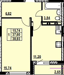 ОДНОКОМНАТНАЯ №6538.93 м2 Однокомнатная №65забронированаОбщая площадь