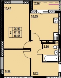 ДВУХКОМНАТНАЯ №4748.65 м2 Двухкомнатная №47забронированаОбщая площадь