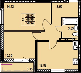 ДВУХКОМНАТНАЯ №14550.94 м2 Двухкомнатная №145свободнаОбщая площадь