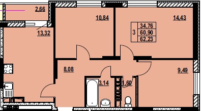 ТРЕХКОМНАТНАЯ №14062.23 м2 Трехкомнатная №140свободнаОбщая площадь