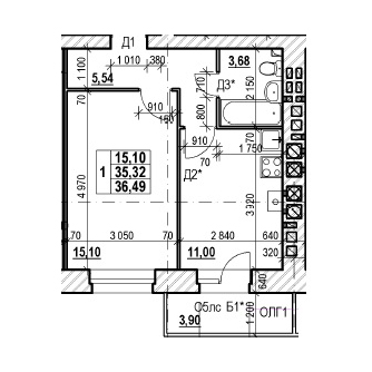 ОДНОКОМНАТНАЯ №9636.49 м2 Однокомнатная №96проданаОбщая площадь
