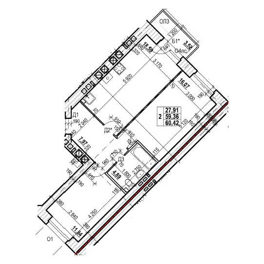 ДВУХКОМНАТНАЯ №17060.42 м2 Двухкомнатная №170проданаОбщая площадь