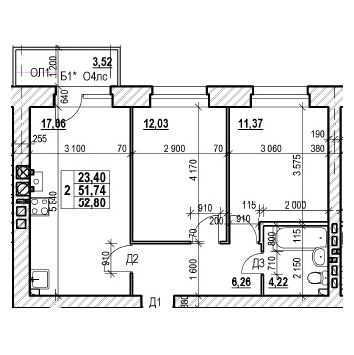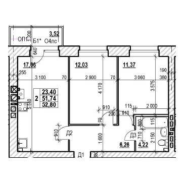 ТРЕХКОМНАТНАЯ №12070.52 м2 Трехкомнатная №120проданаОбщая площадь