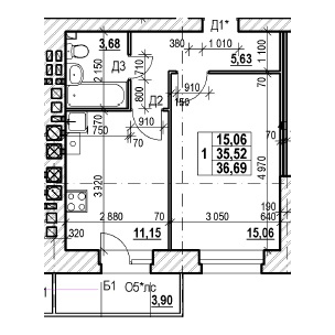 ОДНОКОМНАТНАЯ №15238.57 м2 Однокомнатная №152проданаОбщая площадь